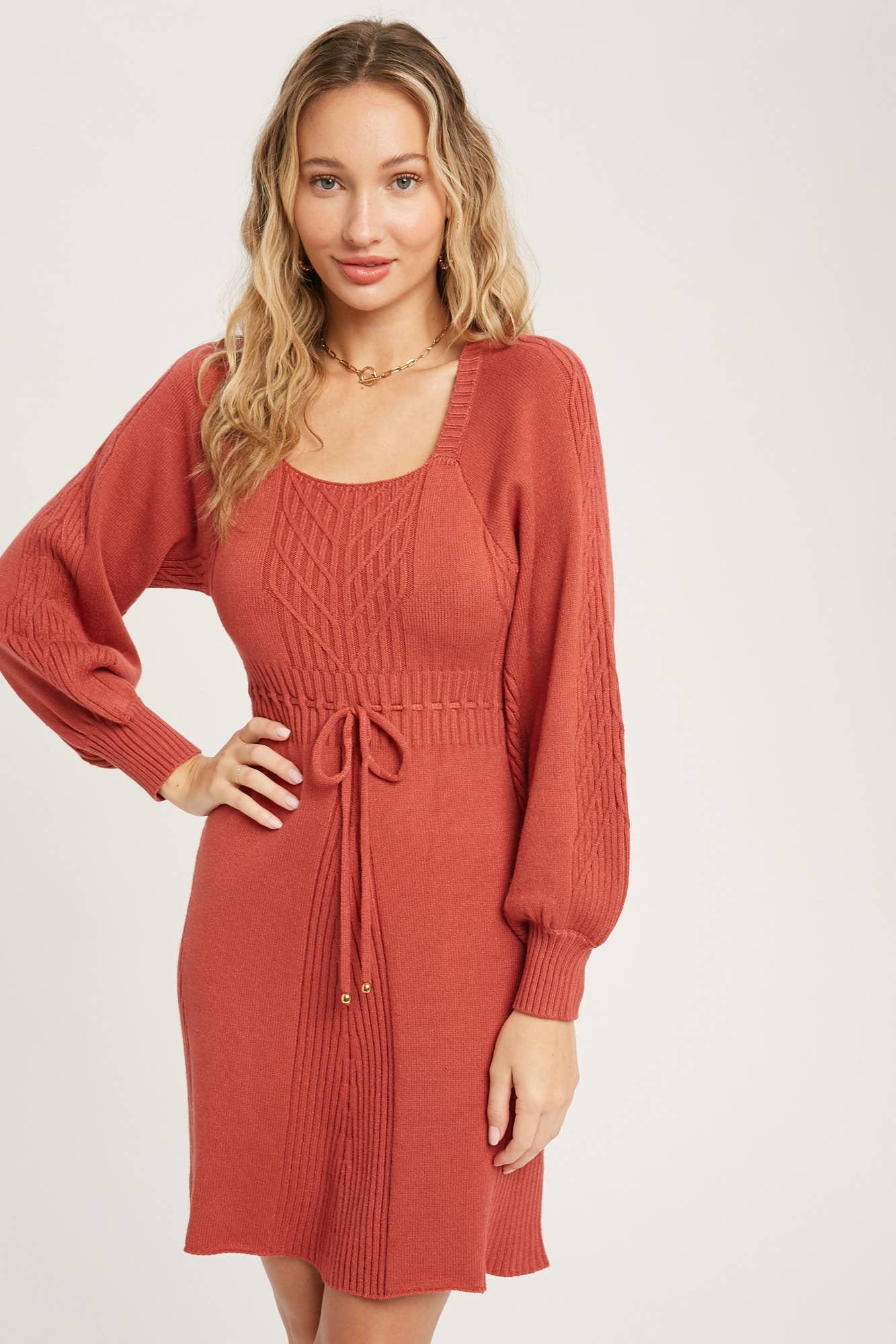 This comfortable sweater dress showcases a full cable knit pattern, a distinctive square neckline, and voluminous long sleeves. It includes a drawstring waist that enhances the fit-and-flare shape for a flattering look. The model stands 5'8" and is pictured wearing a size Small.